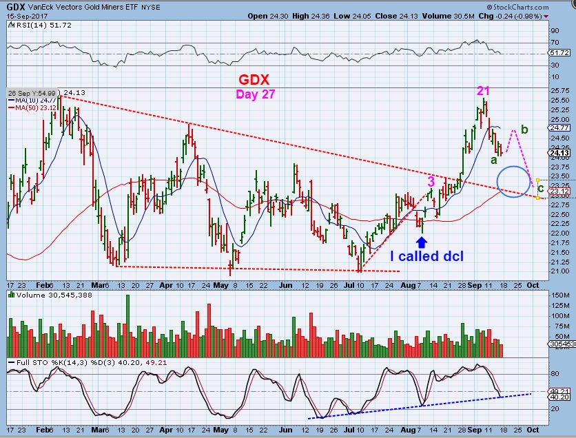 GDX #2 WARNING – If GDX rallies into the Fed Mtg on Monday , Tuesday, & Wednesday, we could still get this common sell off pattern after the Fed. This would be very tricky if one added leverage at ‘a’, so I may not be adding leverage unless I get a clear idea of where the DCL is.