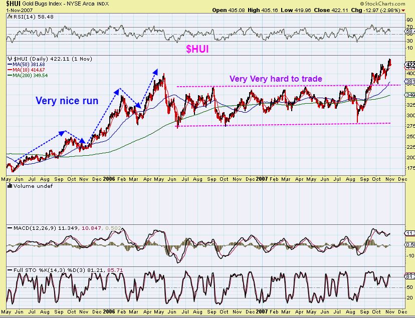 HUI – 2006-2007 – A LONG consolidation with daily cycles evident.  I hear people say things like,  ” This is not normal”  “This is weakness and not a good sign for the Bull”.   🙂  They are guessing and letting their emotions and frustration get to them. They are not accurately reading what is taking place.