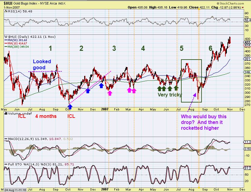 HUI – Look how many peaks a dips there were then. Frustrating?  Yes. This was very tricky at times, especially when waiting for a dcl  (double bottoms, false starts, etc), but the deepest sell off shake out into August lows of 2007 was the ICL to buy after such a consolidation.