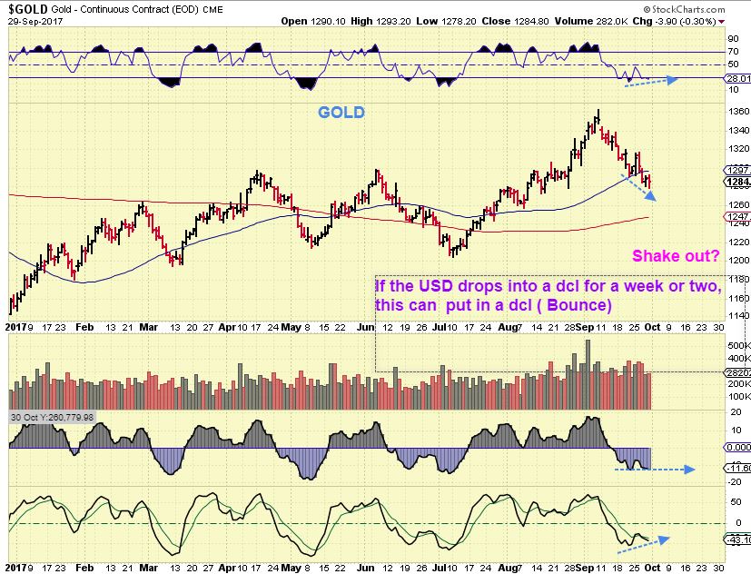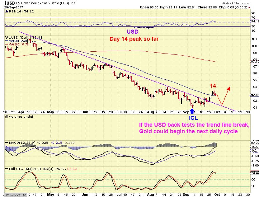 USD DAILY – I will switch to the DAILY USD chart, because we are witnessing the expected change.  We have an ICL that has formed with a daily swing and break out higher  ( A break above the trend line, 10 & 50sma). So we have a swing low in the daily and a swing in the Weekly charts.  Daily cycles for the dollar tend to run SHORTER that the stock markets, so day 15 could lead us down into a dcl, and that could help Gold find a daily cycle.