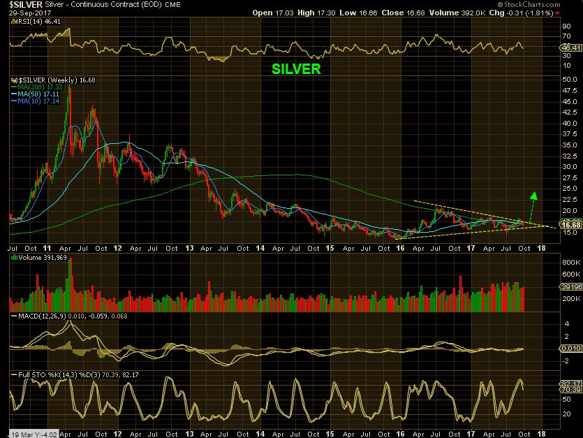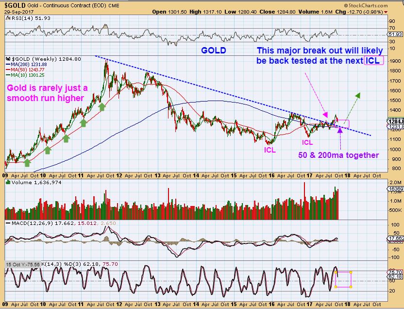 GOLD WEEKLY  – Bigger picture-   Yes, I hate the dip into an ICL when I am planning on a strong bull run too, but with the USD putting in an ICL, we now may need to recognize that Gold can eventually roll over after the next bounce.  An eventual ICL drop is NOT saying that GOLD has to sell off  in a bad way. A back test of this trend line should be expected, so maybe that is what the ICL will do.  These dips are normal in Bull markets too,  take a look at the Green arrows in the 2009-2012 Bull Run. Dips were normal. Currently we have an ICL in 2015, a higher ICL in 2016, and another higher ICL in July 2017. After a back test, we could make a run for the 2016 highs and then break them.