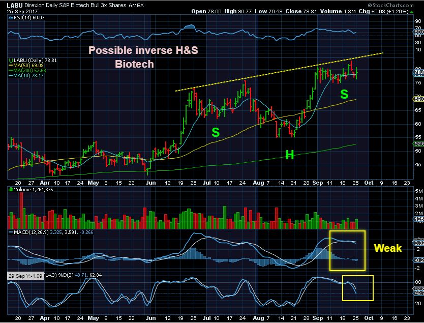 LABU – SO LABU has been a rough ride, too difficult to ride from last summer to now ( I sold mine for decent gains a while back), but if the XBI goes to 90 this inverse H&S could run to 100 in my opinion.  This is my chart in a report from Sept 25, as a bullish set up. It is now 85.50.  In AUGUST  XBI went from roughly $75 to $85, LABU went from  $55 to $80.
