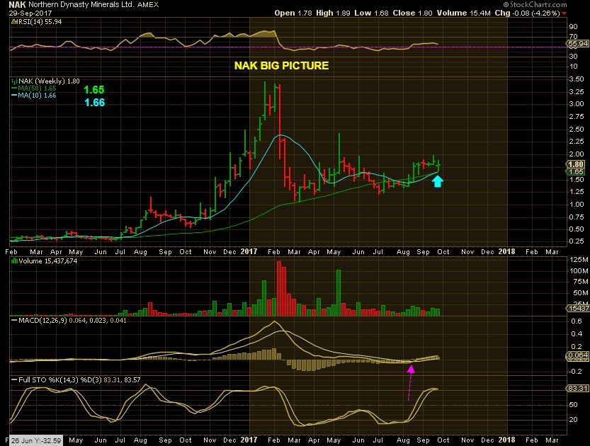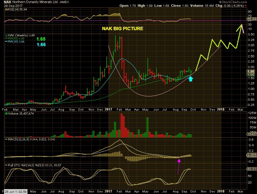 NAK –  NAK bounced right off of the 10 & 50 weekly MA combination last week. Big picture bullish after a huge run on 2016 from $0.20 cents to $3.50ish. Can you picture this forming a large Cup?