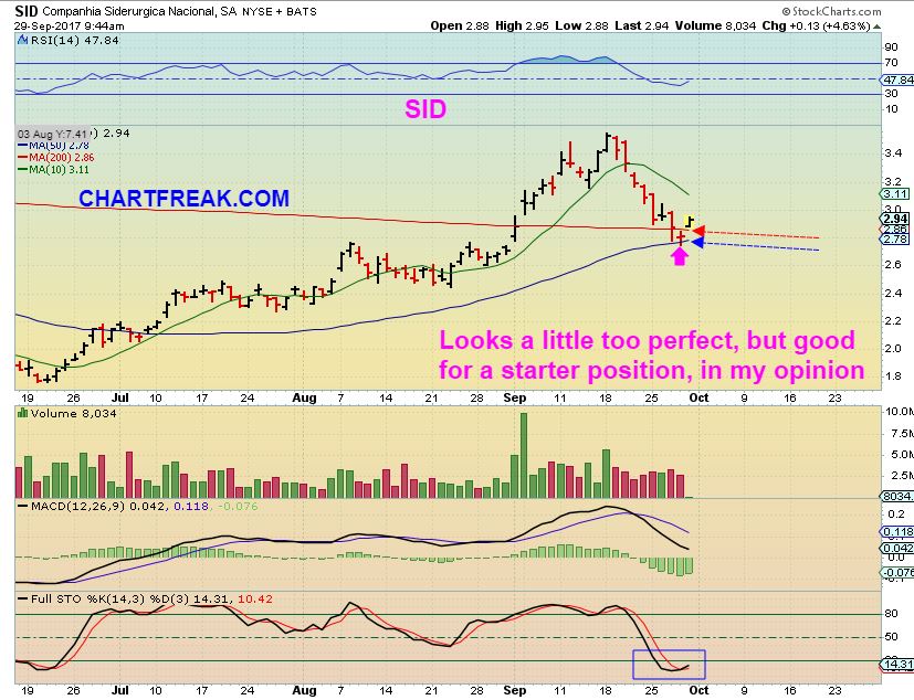 SID- I liked SID Friday & posted this in the comments, but it is almost too perfect.  Look again at STEELS chart above. If that has 1 more drop toward the 50sma,  Sid may do a quick ‘shake out’, so I want to wait a bit more ( or start a small position & add on a dip or break out higher).
