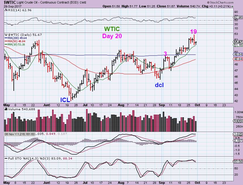 WTIC – The daily peaked on day 19 and Friday tagged the 10sma, we may only see a 1/2 cycle low here, since Oils daily cycles can be 50 days long. I think that OIL has more upside, so Oil & Energy stocks have been mentioned in the daily reports. This may run sideways to the new trend line from the low and Sept 11 dip.