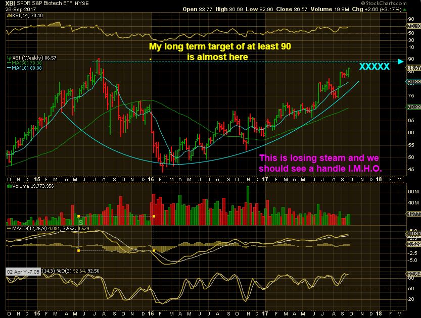XBI– Slowly but surely,  the ETF is approaching 90 and it still has a very bullish look to it  ( Big Picture). AT the 90 area, this could form a handle, as drawn with the XXXX.
