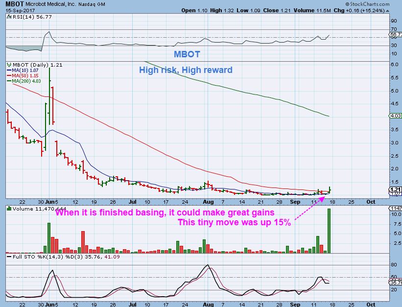 MBOT – I had MBOT in yesterdays report, but this in the report for September 15 as it began breaking above the 50sma. You can see how long it can take for one of these bases to break out & go. This was weeks ago. Please read the chart.