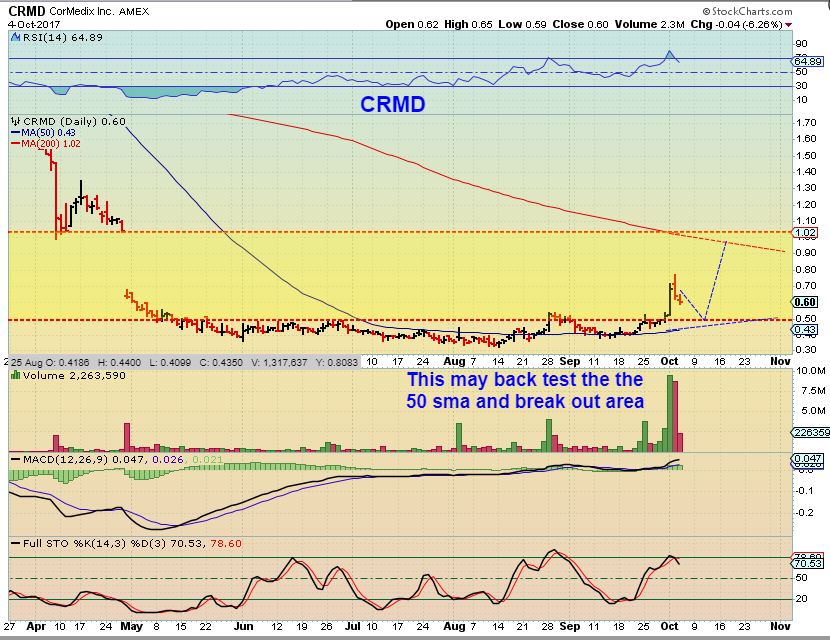 CRMD – And off it went. It pulled back Wednesday, so it could do a bull flag or back test as shown. That would be another buying opportunity in the future.