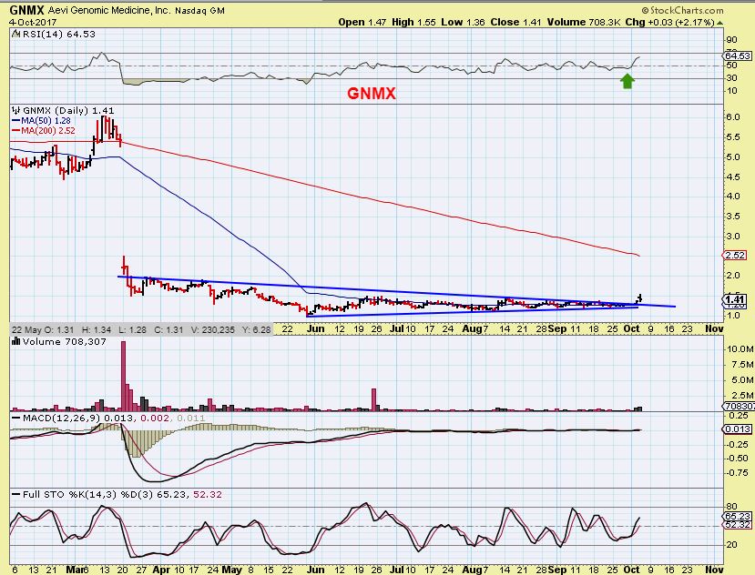 GNMX – At the end of yesterdays report, I said that GNMX was on my list. It gapped open Wednesday and sold back off. I took a position when the gap filled and I still think that this has the potential to continue higher. Why?…