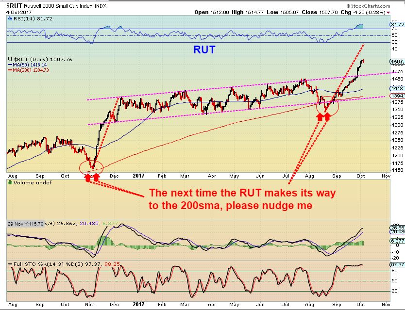 RUT – The RUT ( or IWM) has been running straight up, similar to last November, when it tagged the 200sma and took off higher. Please read the chart.
