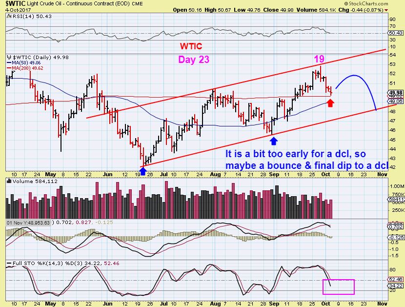 WTIC – Oil has a day 19 peak on the 2nd daily cycle. It landed on the 200sma, so it may bounce from here and seek out a dcl later.