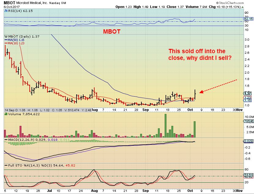 I mentioned that I was adding to MBOT yesterday. It ran higher and then it sold off into the end of the day, back down to my ‘add’ point near $1.30. Did I sell? No, I added a bit more, but why? Well, for one thing these are exploding out of their bases and I am willing to wait for this to make the run higher, but also…