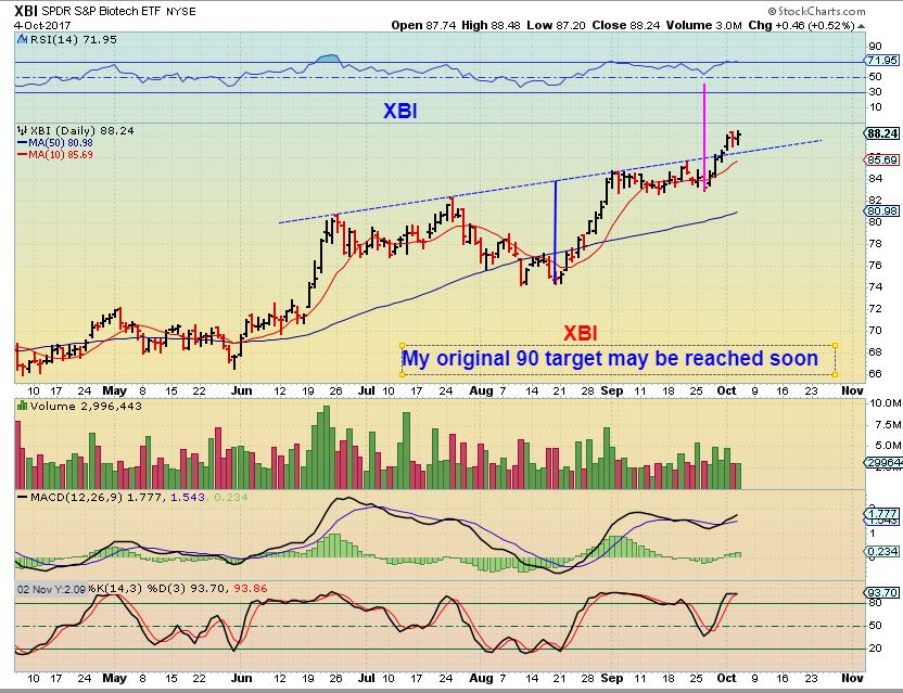 XBI– XBI hit 88.48 , which means that it is reaching my initial 90 target from last summer, but it can extend beyond that over time too.