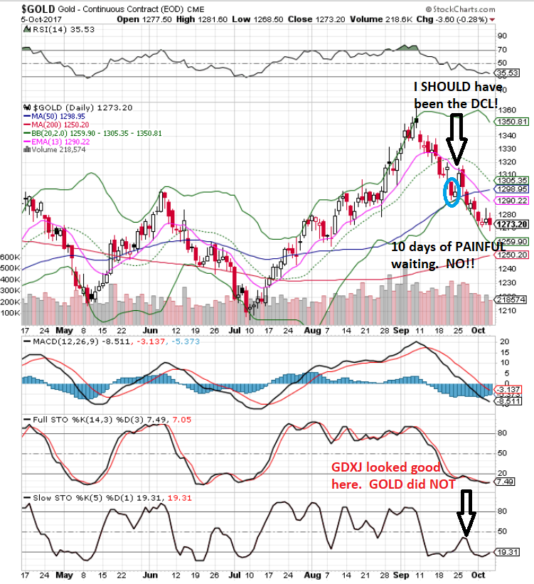 Are all DCLs the worst ever? No! The last one that you called in August was pretty good! (threw you a curvevall there). So, I drew up a chart to help explain. Last point – was looking at GDXJ chart last night and the stoch was positive and MACD getting ready to go and the RSI (14) was at 48 and poised to break above 50. So when I got up this morning to see the Fed had trashed gold overnight was just really, really disappointing. DARN YOU FED!