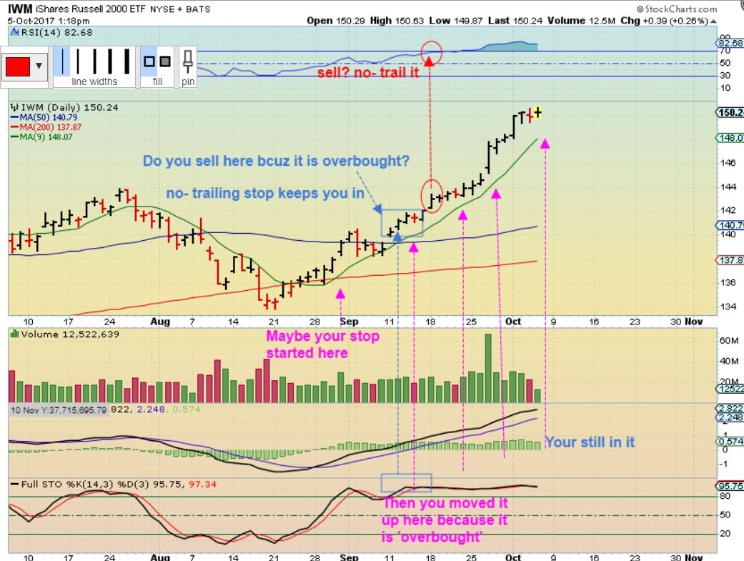 Look at this chart of the IWM ( Or RUT). Instead of selling because it looked extended or overbought a week or 2 ago, you use a stop that follows it higher, and a trailing stop keeps you invested as it moves higher day after day.