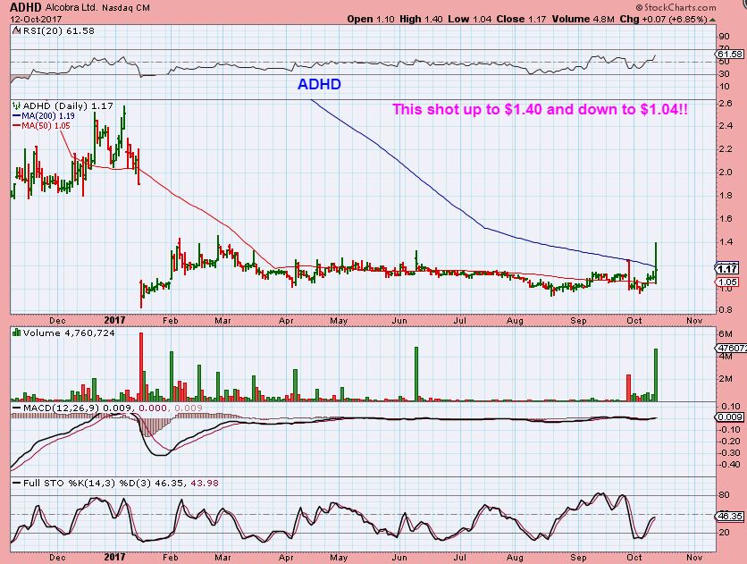 ADHD –  This ride was already crazy yesterday alone.  I bought in on average around $1.13 and it took off to $1.40 for a while, then it dropped back to red and tagged the 50sma, hitting $1.04, and then moved higher and closed at $1.17.   That was ridiculous.  I am still in it, but I had to purchase some Pepto Bismol after that ride 🙂  Actually,  my position is small. Maybe 5% of my trading account was on this one.