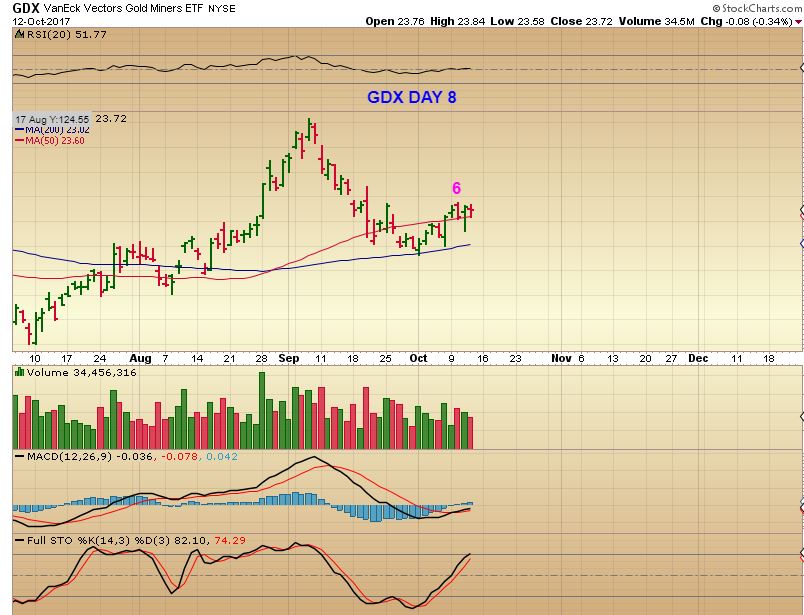 GDX – GDX peaked on day 6 so far, and today will be day 9.  I am not expecting a rally above Sept highs, I’m expecting this to peak here or pretty soon, and then for it to roll over into a dcl as the USD rallies.