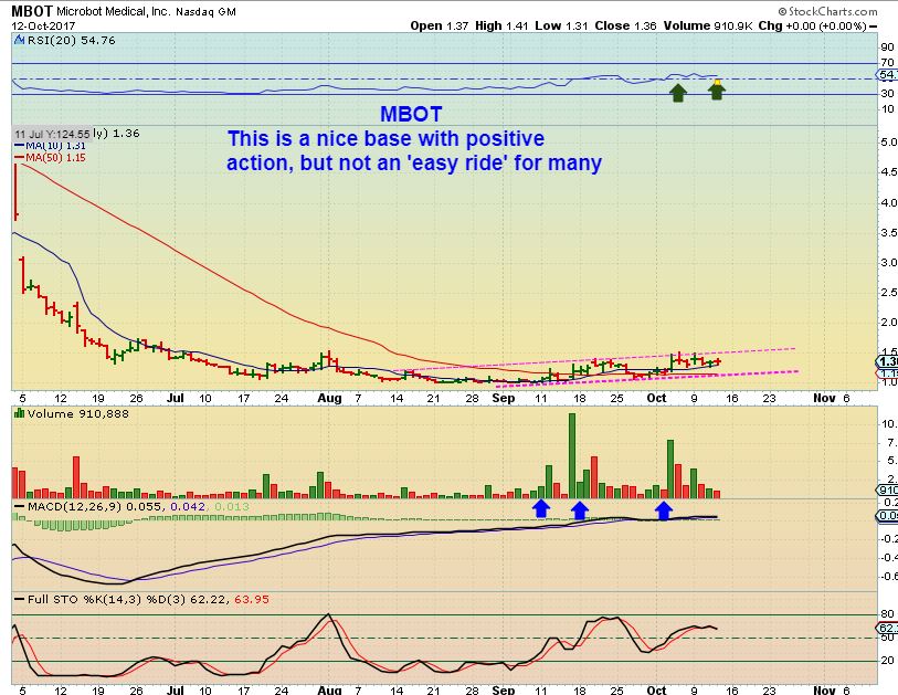 MBOT – I am still in MBOT for example,  and that has positive activity so far, but not always an easy ride.  Some may wait until it breaks out higher and starts a stair step pattern.  Day to day can be tough with this one, since it moves in big daily swings or it can be boring day after day.  The upside potential far outweighs the boring action to me. I’m trying to invest in this with patience.