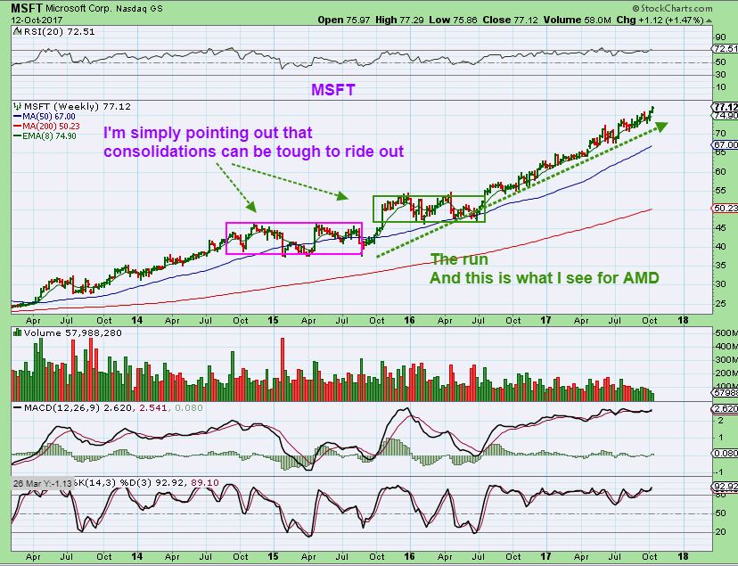 MSFT– As you can see, this is a great run by MSFT.  It has almost doubled since I called this a “Long Term BUY & HOLD” back when it was consolidating, but that is the point of this chart.  Look at those long consolidations in the boxes. I am always pointing out that the reward is great, but holding those consolidation periods is difficult and even boring at times. This is a weekly chart and those consolidations lasted for many weeks.  With that in mind…
