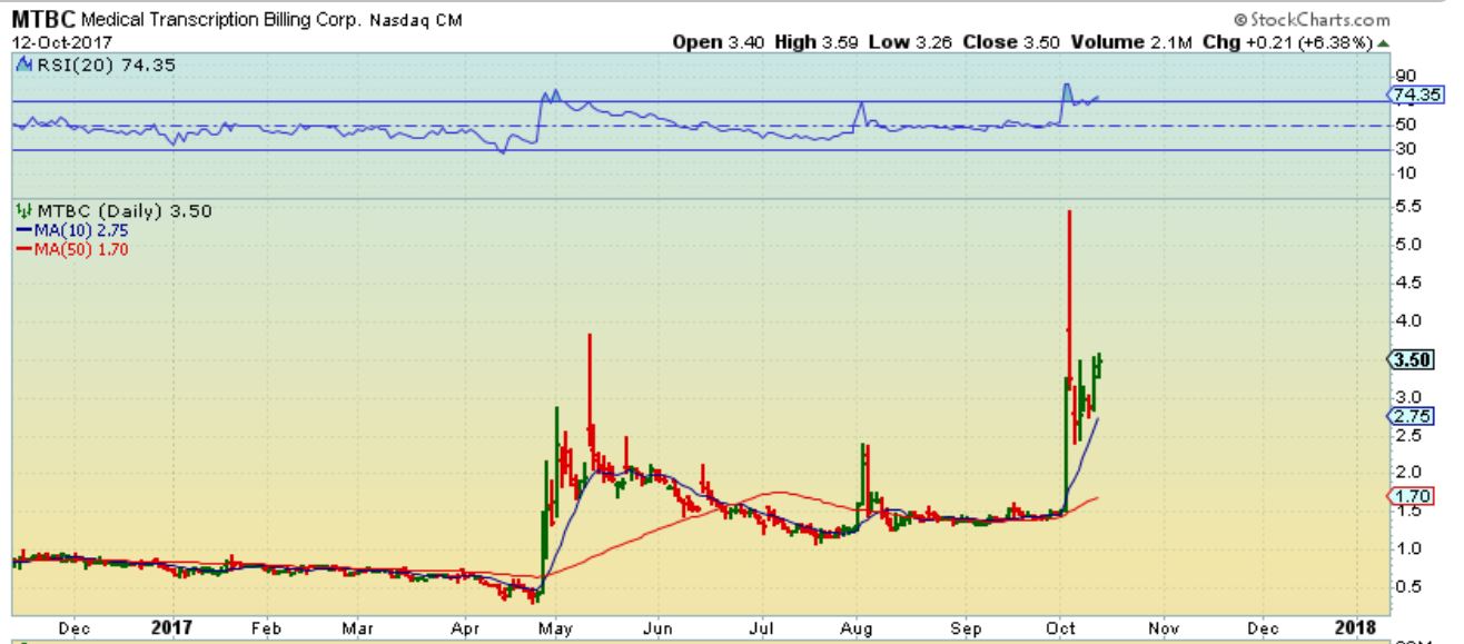 My Disclaimer has been:  There are NO GUARANTEES in this sector, but certain ‘set ups’ can build energy for a rapid acceleration higher, and we have been seeing that. When I bought MTBC, for example,  it Popped and more than tripled in 2 days!  See the chart below of that day.   Yesterday INFI doubled.  The set ups are explosive, but this is not a get rich quick plan. There are risks, so position size should be reasonable,  and these trades are NOT FOR EVERY TYPE OF TRADER. They move fast in both directions.