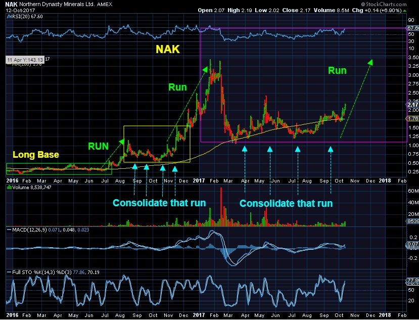 NAK –  Notice how NAK makes a strong run, then consolidates for weeks, even months, and then runs again.  Look at the 2016 consolidation, it is very similar to the present one. Look at the run that followed.