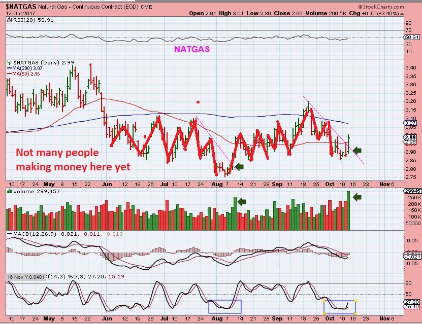 NATGAS– I haven’t been trading NATGAS due to the choppy consolidation.  NATGAS inventories come out on Thursday and we saw a good POP in Natgas.  Natgas looks to be on day 3 of  a new daily cycle, as it closed above the 10 & 50sma and broke above the downtrend line. All of this choppiness has happened with NATGAS trapped under the 200sma. Maybe it has built up enough steam to blast through and put together a lasting run now.