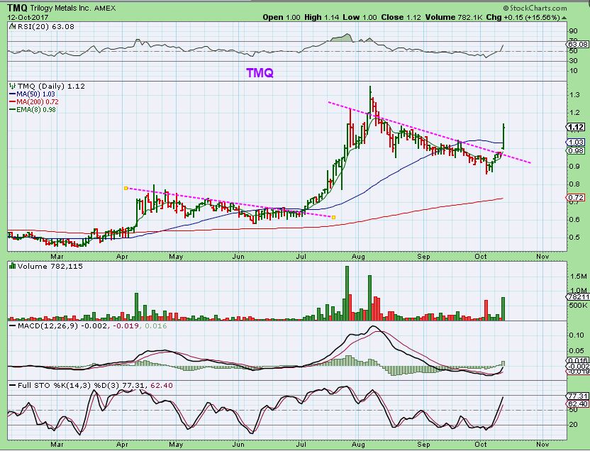 TMQ–  TMQ actually broke out and ran 15% yesterday.  This spring TMQ was under 50 cents and is now over $1 again. Long boring consolidations and then a nice run higher. It looks ready to run to new  highs.