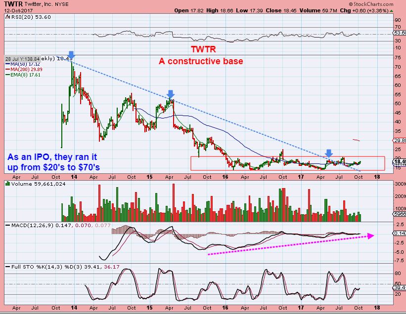 TWTR #1 –  I believe that it is in the base stage ( Notice that AMD had one too). The problem is that we can’t tell how long the companies will base out, so some just wait for a complete break out before entering.  This looks like it broke out above that blue down trend line though, and back tested. It is still in a base, but may be ready to break higher.