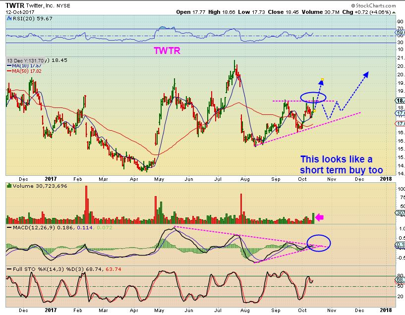 TWTR #3 –  This looks like it wants to break higher shorter term too.  From $14 to $20 back to $16 and now rising.  It is not easy to buy & hold, but this does look almost set to break higher in this wedge.