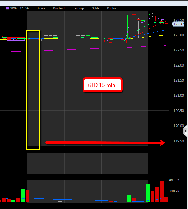 I haven’t posted any long tail candles for awhile. I just happened to see a real scary one this morning while flipping around my charts. And since it’s getting close to Halloween I thought I’d post this scary candle of GLD from the AH yesterday pointing to a low near $119.50 which would take out the October 6 low. Yikes!