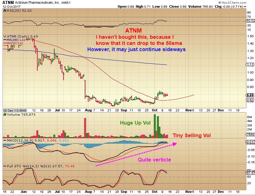 ATNM-  I do not own this, but I like that it Popped and is BARELY selling off , and is selling on very light volume. See the chart.  A stock like this often runs to the 200sma after breaking out, and that is a good size %-Gain.