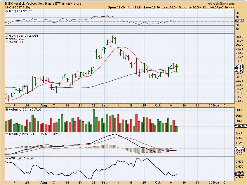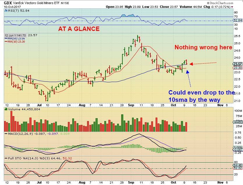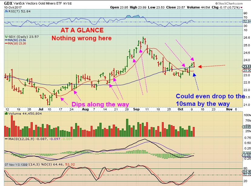 GDX #1 –  And the GDX chart at a glance doesn’t look bad at all, as DAY 6 peaked as the highes day so far and stayed above the 50sma so far.  Sell and lock in your position if you are uncomfortable.