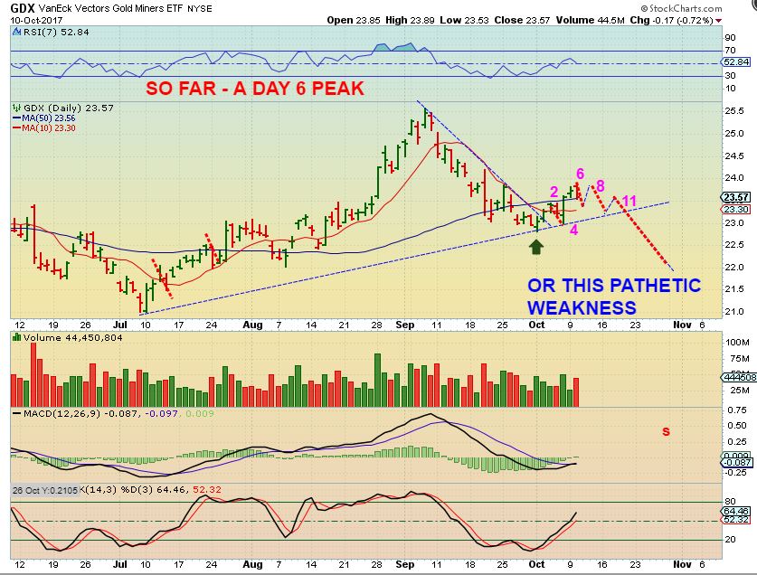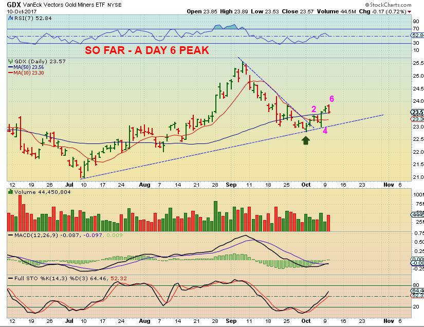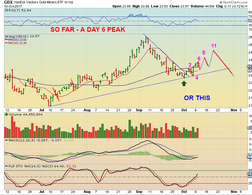 GDX #6 – This sideways ‘weakness’ would have a day 6 peak in place (Yesterday), and then a roll over into that dcl. after Gold Peaks.