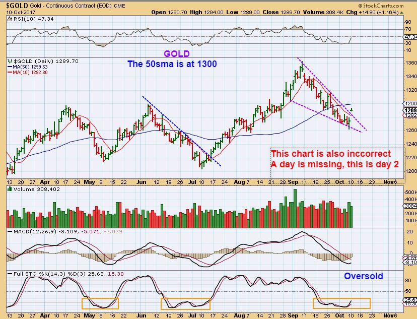 GOLD –  I also think that this stockcharts chart is incorrect, because Mondays trade seems to be missing, however it shows the trend line break and break above the 10sma  ( DCL)