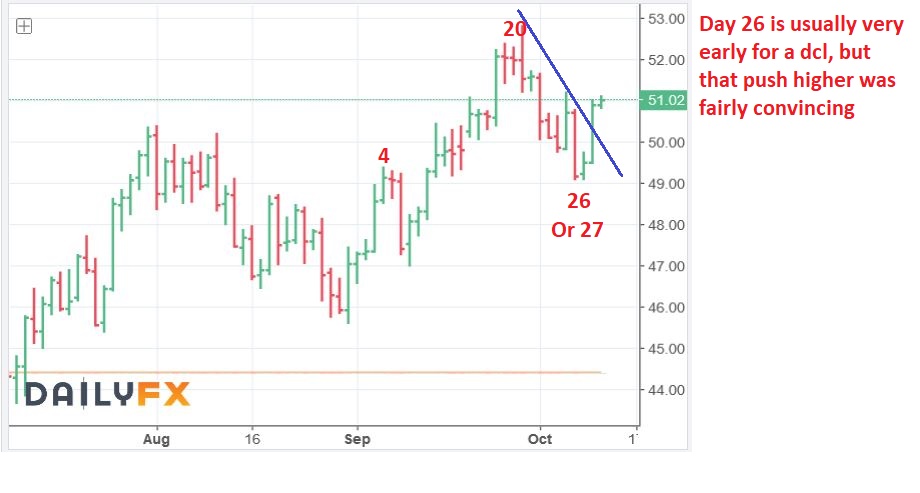 OIL –  This shows that big POP on Tuesday and a dcl on day 26?  I tend not to think so,  they usually occur day 30 onward, but never say never in these markets.  Oil did look strong with that pop.