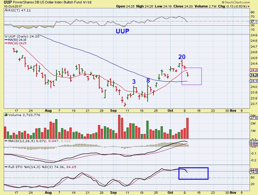 UUP ( USD) – The USD continued its drop with a swing high in place, and Gold continued its pop, but Miners did not.  We’ll discuss that soon.