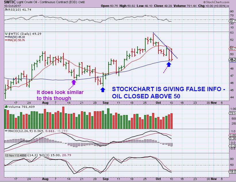 WTIC –  This chart from Stockcharts is inaccurate, OIL actually shot higher and closed over the $50 mark. That type of a pop may look similar to the strong POP in August that bounced off of the 50sma and then still rolled over into a dcl, because I believe that it is too early for a dcl. here,  so…