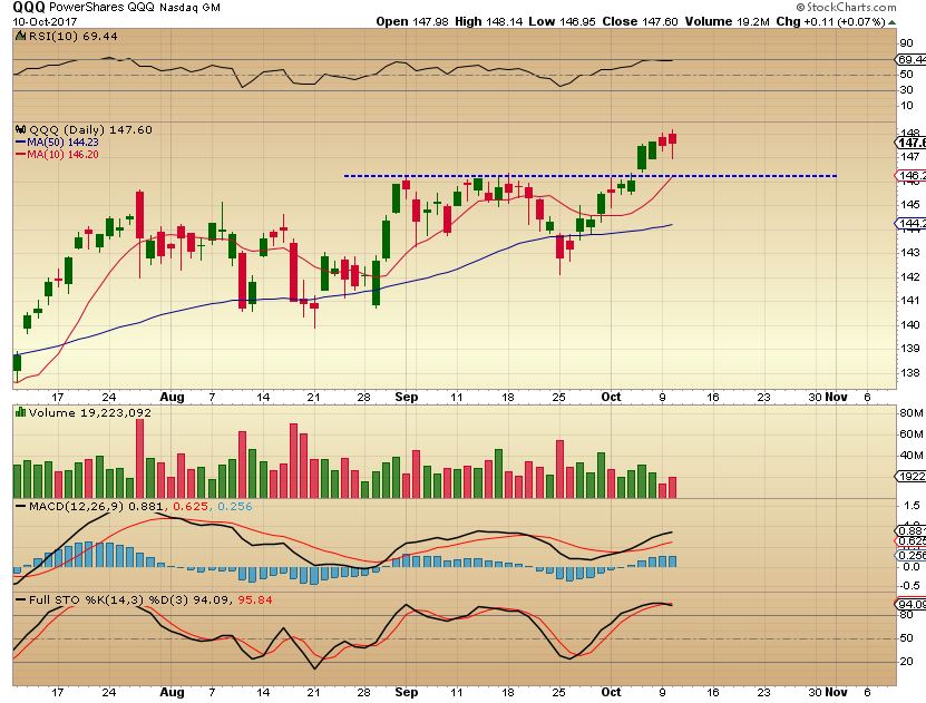 QQQ –  The NASDAQ consolidated this time, rather than rally higher like the DJIA, RUT, and SPX.  Since it just broke out, the dip for the QQQ could be a back test or tag of the 50sma.