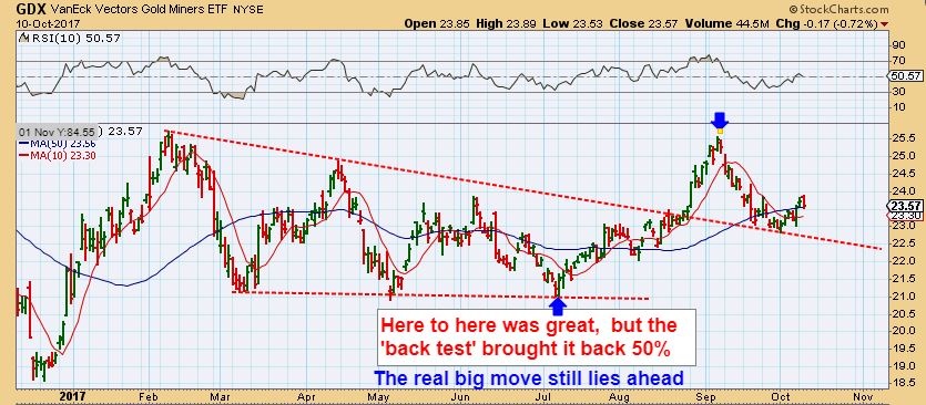 GDX #3 – Can this drop to the 10sma and reverse & run to new highs on maybe day 8 or even 10?  YES.   Can it drop to the 10sma, get stuck under the 50sma, and have a day 6 peak and roll over later?  YES.  Yes, that could be the peak,  decide NOW where you will sell as a downside limit.