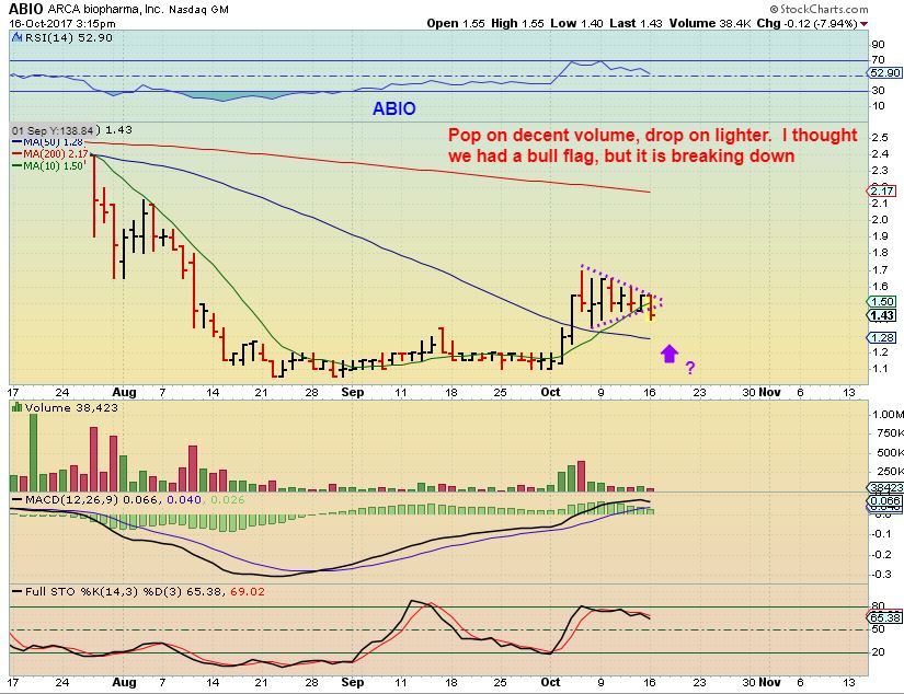 ABIO – This is just one of those biotechs that I was watching. It was a bull flag type consolidation, but is dropping to the 50sma. Volume on the drop is light, so I may keep my eyes on this for a bullish reversal off of the 50sma.