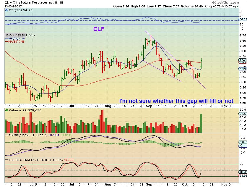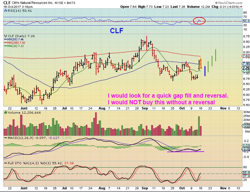 CLF FRIDAY – This was a BIG jump of over 10%, and really looked Bullish. I would have mentioned that the gap could fill, and let’s watch this on Monday because that volume & break of the 200sma looks convincing.