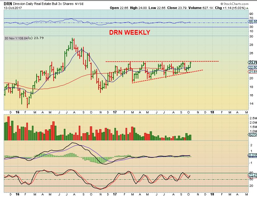 One of our readers ( Thx Peter) Asked about the Real estate 3x Bull ETF DRN. This chart actually looks quite bullish. It pulled back Monday, but we are near the APEX and it could break out in the future. I would say that it is a buy if it drops to the lower trend line again. $22 area?