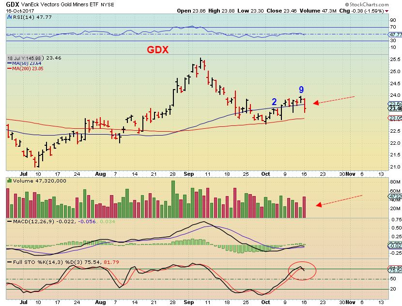 GDX- GDX peaked on day 9 and dropped below the 10sma, 50sma and volume increased on the way down. This is a swing high and looks like we will be getting our anticipated L.T. Daily Cycle.