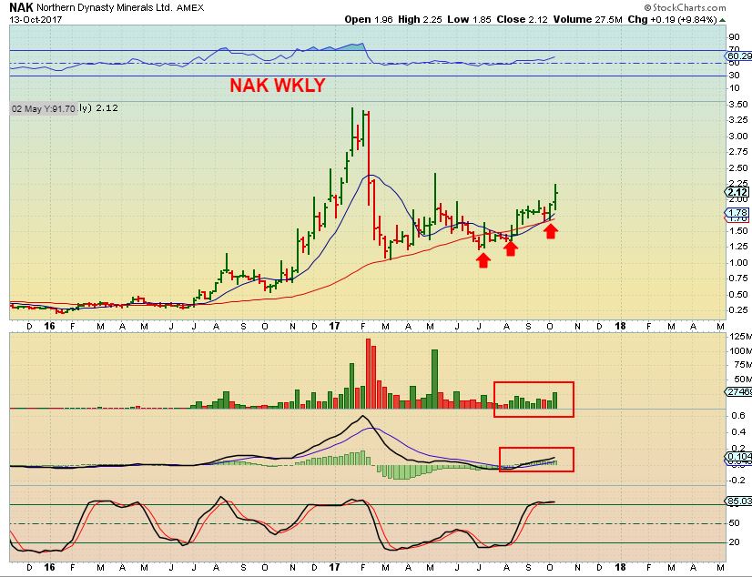 NAK WEEKLY – This was taken Friday when it was $2.12 ( before Mondays drop), but it is to show the big picture and support as it trends higher. It closed at $2.05 on Monday.