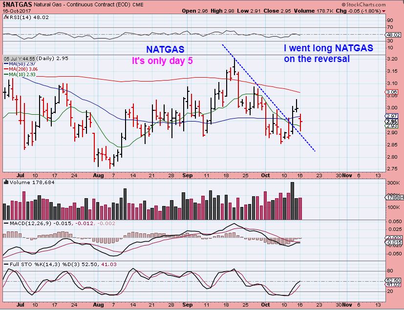 NATGAS – NATGAS dropped down and reversed back above the 10sma. I went long and this is only day 5. It is at the 50sma , and then the 200sma has to be dealt with, so it may not be a solid surge higher. My stop is a break below the trend line.