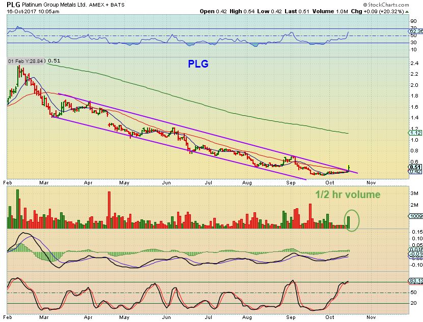 PLG at 10:05 a.m. & up 20% – Maria called this one out in the comments ( Thx Maria), and when I looked at it, Gold & All of the miners were up too. At this point PLG was breaking out with large volume for only 35 minutes of trading. What happened when GOLD & MINERS SOLD OFF into the end of the day?