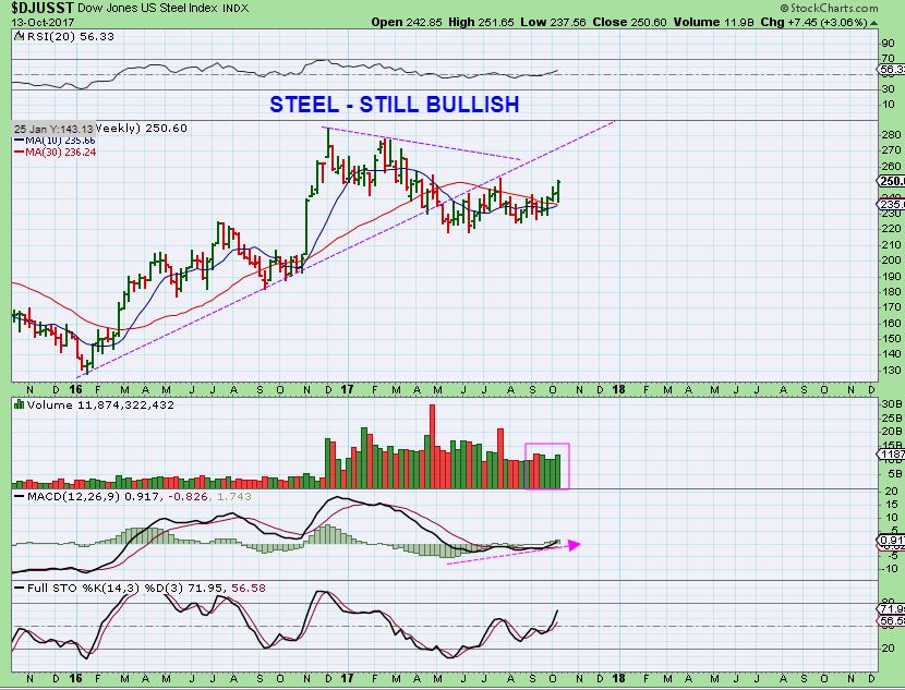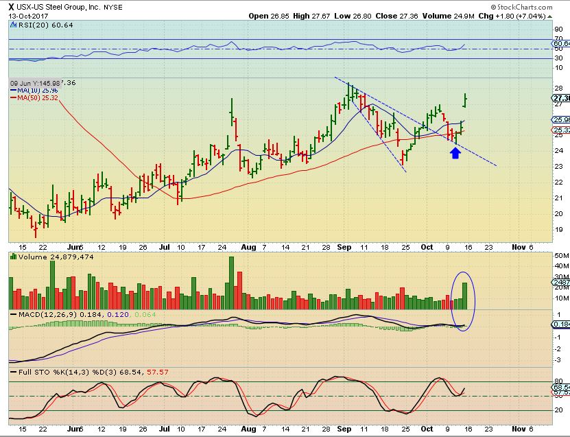 I’ll start with STEEL. You probably recall that STEEL was in the weekend report, and I was showing how we were getting follow through on the Steel call earlier in September. Well, I also collected many charts of the bullish jump in STEEL STOCKS on Friday. Lets take a look at the Friday charts along with Mondays trading in those stocks.