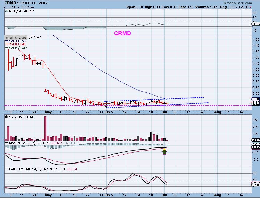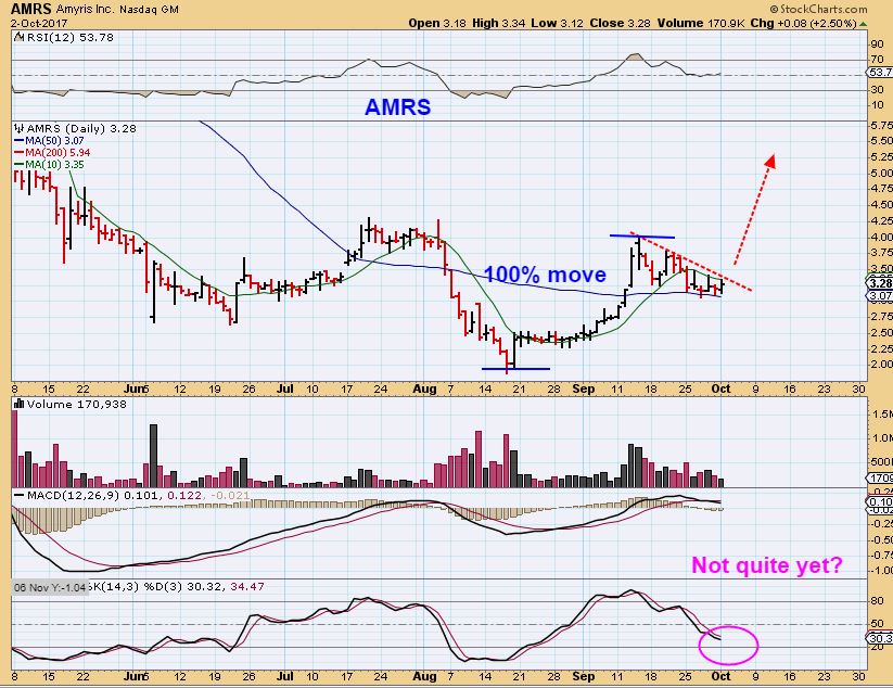 AMRS – AMRS already ran up 100% and is consolidating the gains. This is a bullish set up as it squeezes in this wedge.