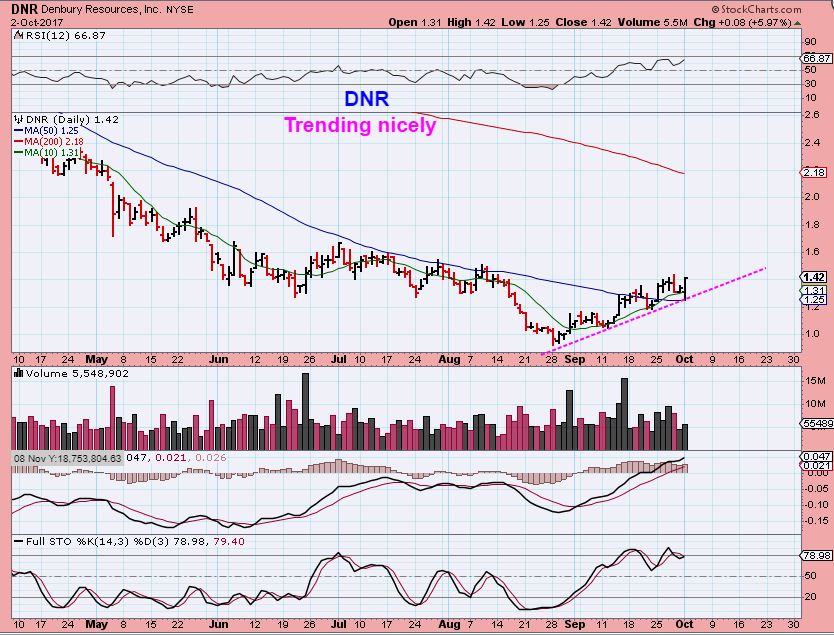 DNR – DNR is climbing steadily higher, still within a base. BUy it here or you could buy it if it pulls back again