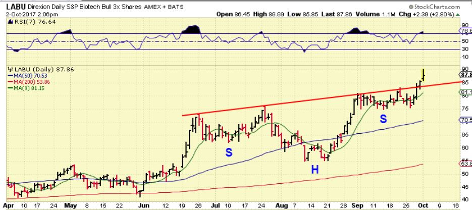 LABU – I had pointed out this inverse H&S Sept 25th, and we are seeing the upside follow through. Many Biotech stocks are Exploding out of their bases. See ECYT. Wow.